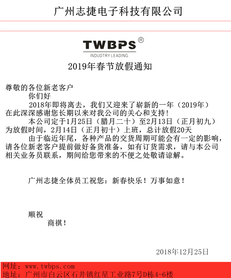 廣州志捷2019年放假通知